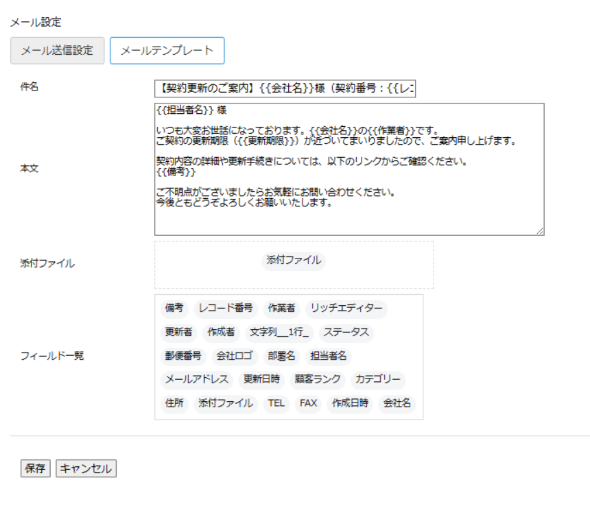 - 直感的なテンプレート作成:件名・本文にフィールドを差し込み、自動送信が可能です。