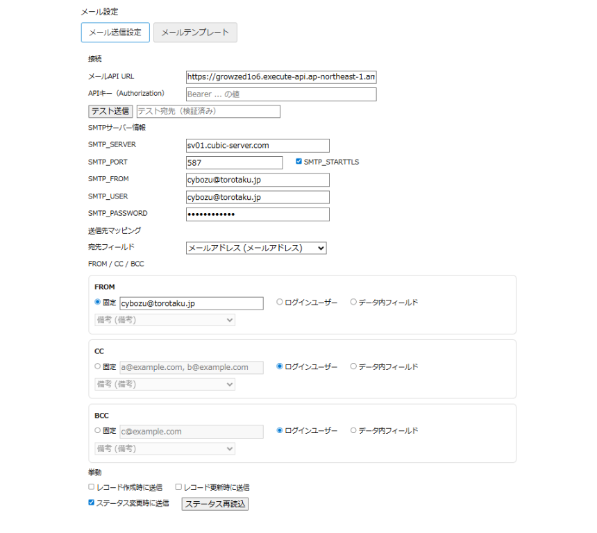- 柔軟な送信先マッピング:宛先・CC・BCCをフィールドや固定値から選択して制御できます。
