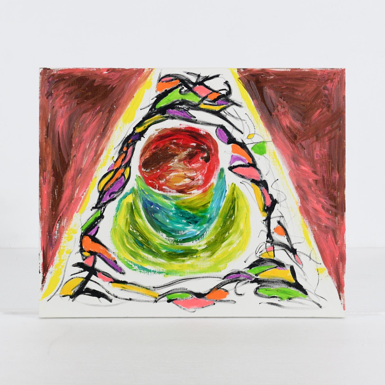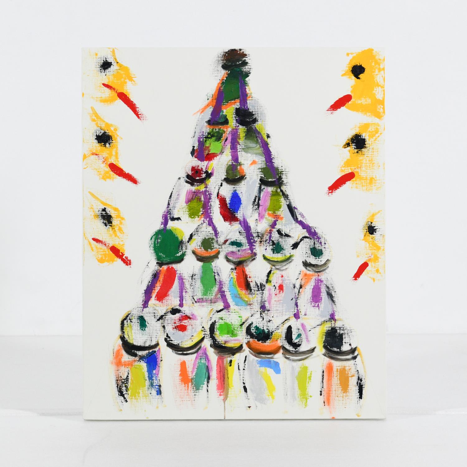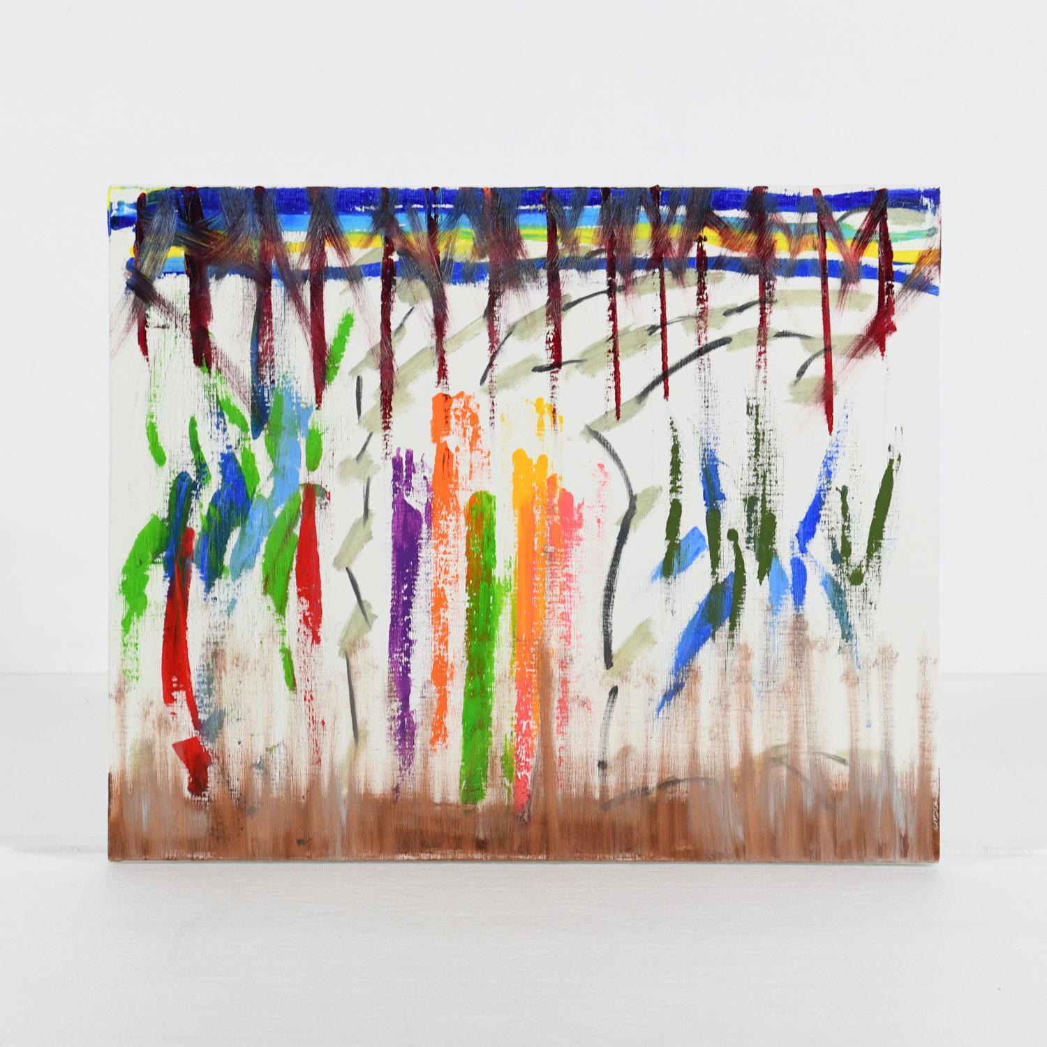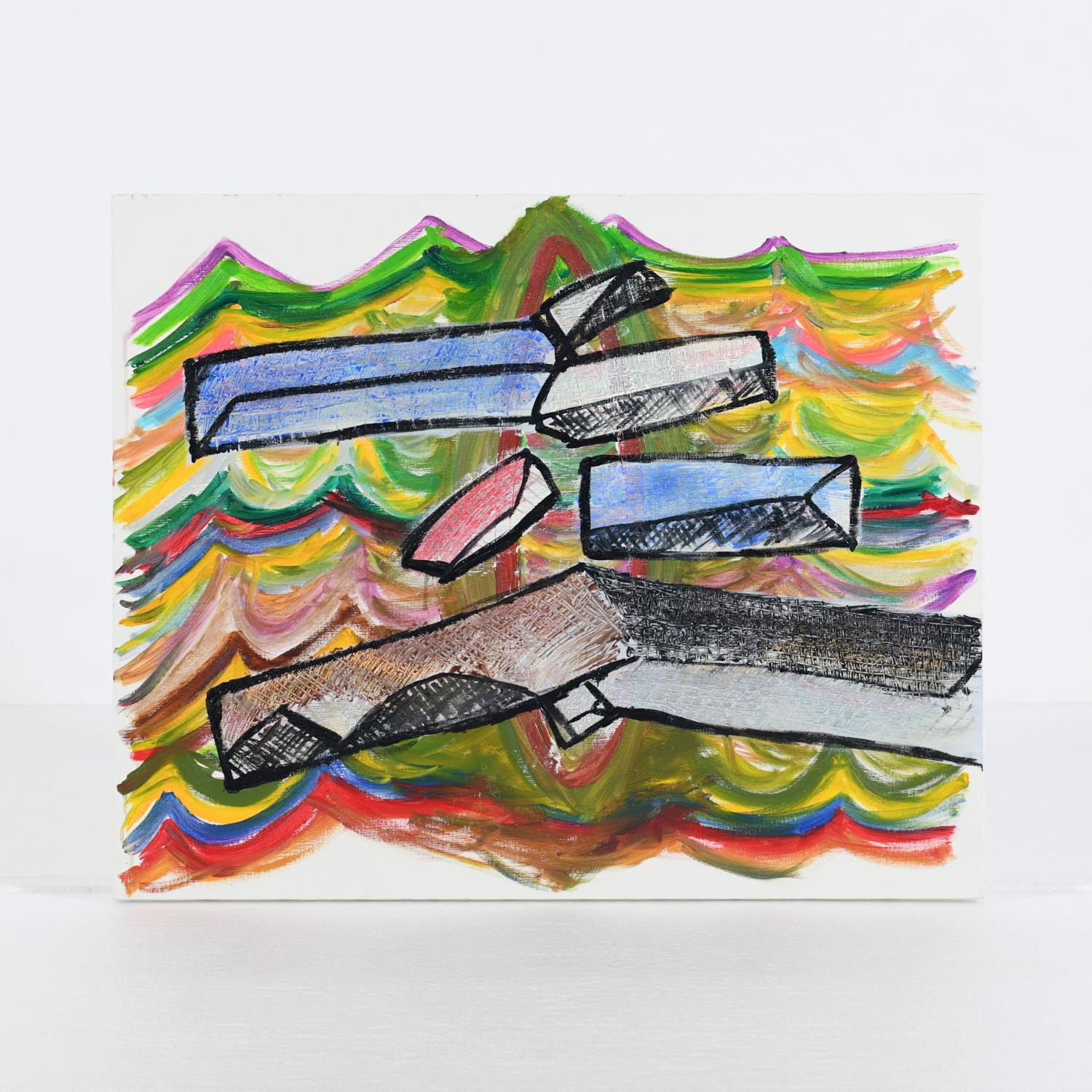 本作は、明確な建築物を描かず、縦方向の反復ライン(緑のストライプ)と、横方向の奔放な筆致(橙のストローク)を組み合わせることで、“塔”そのものよりも、塔を取り巻く混沌・建設のエネルギー・崩壊の兆しを表現している。
