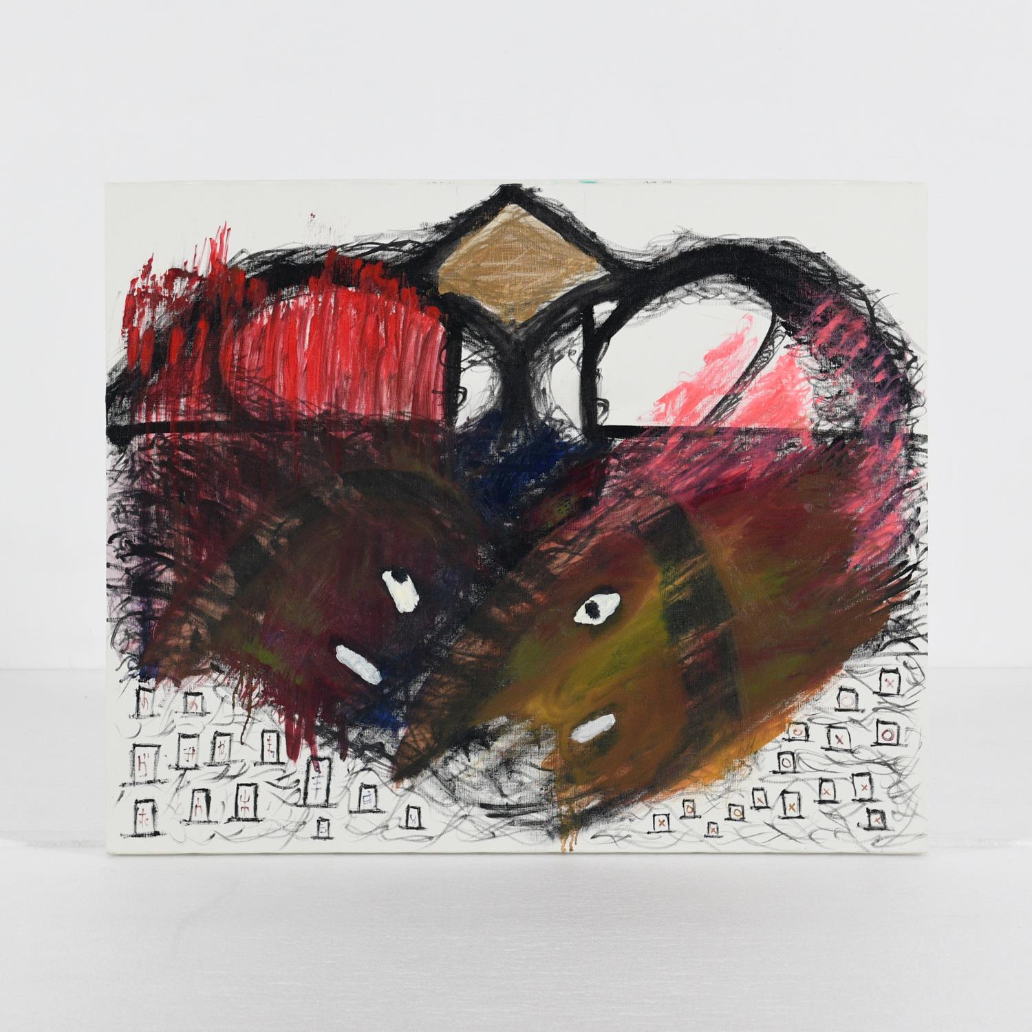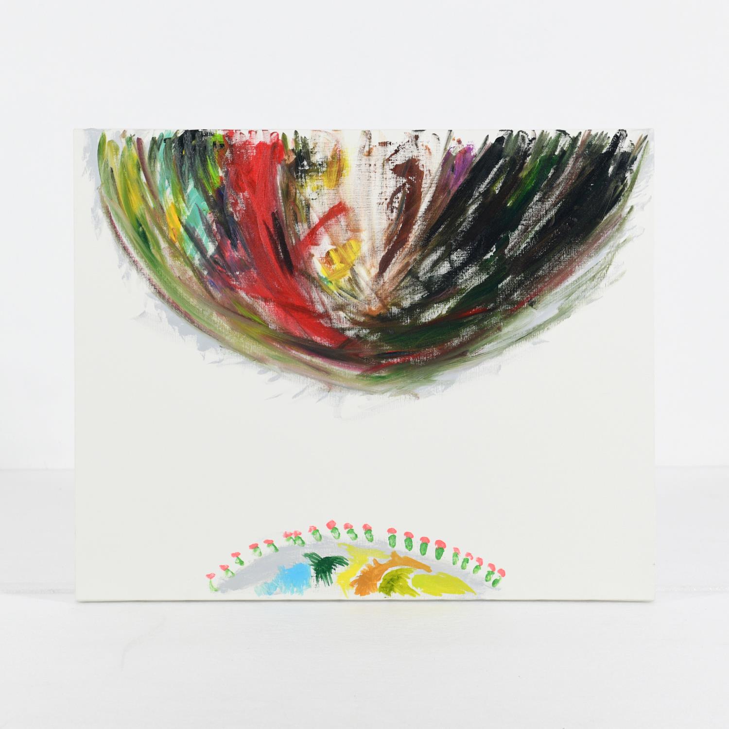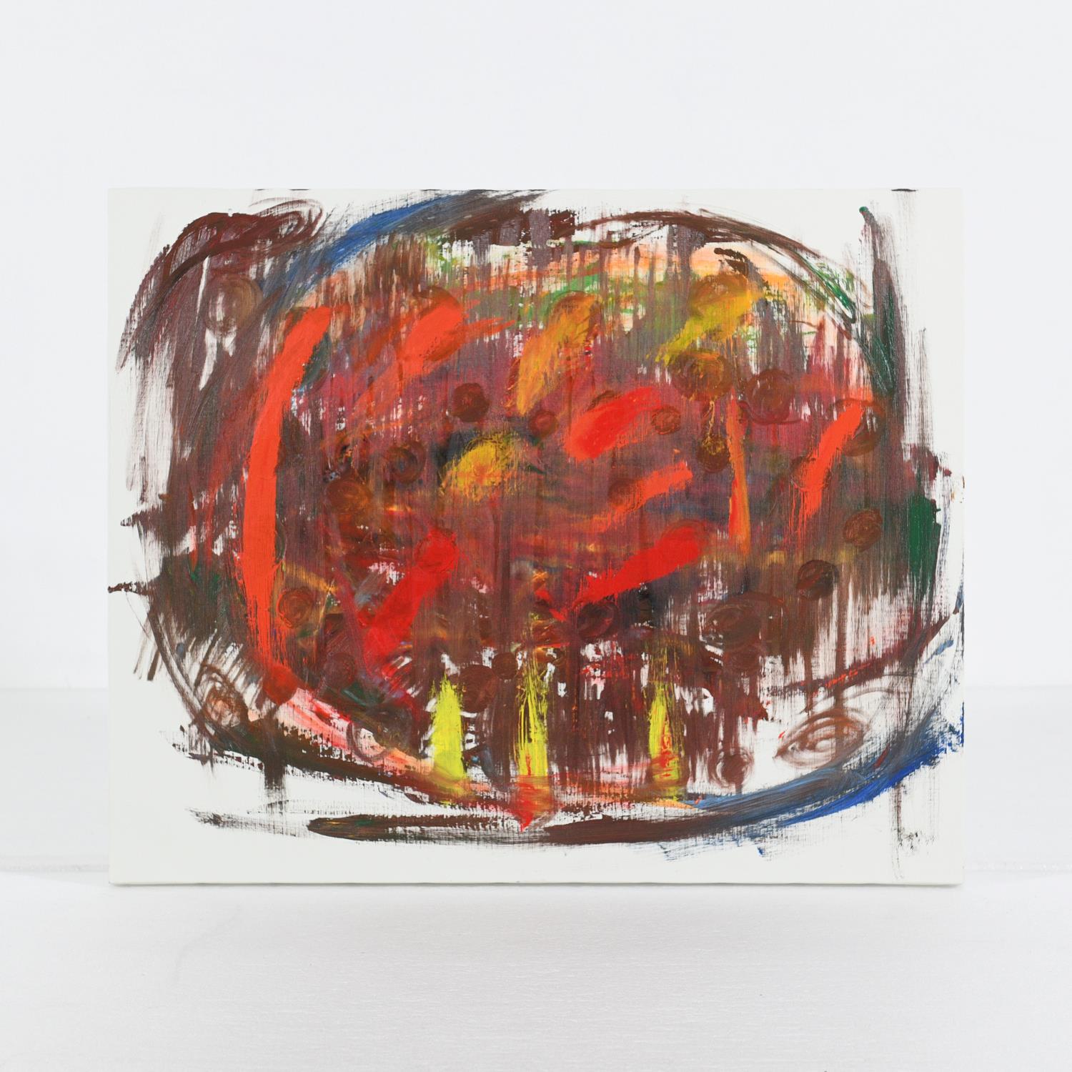 本作は、明確な建築物を描かず、縦方向の反復ライン(緑のストライプ)と、横方向の奔放な筆致(橙のストローク)を組み合わせることで、“塔”そのものよりも、塔を取り巻く混沌・建設のエネルギー・崩壊の兆しを表現している。