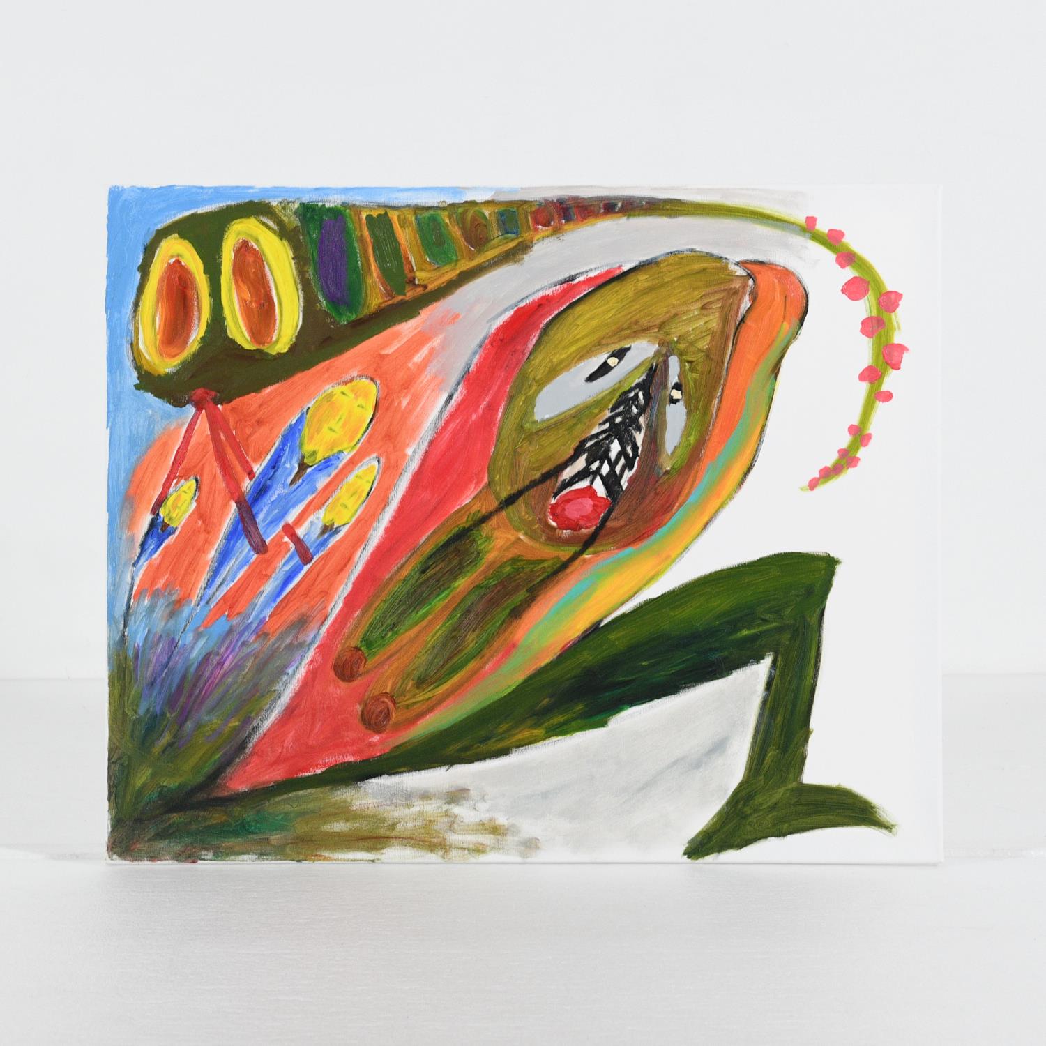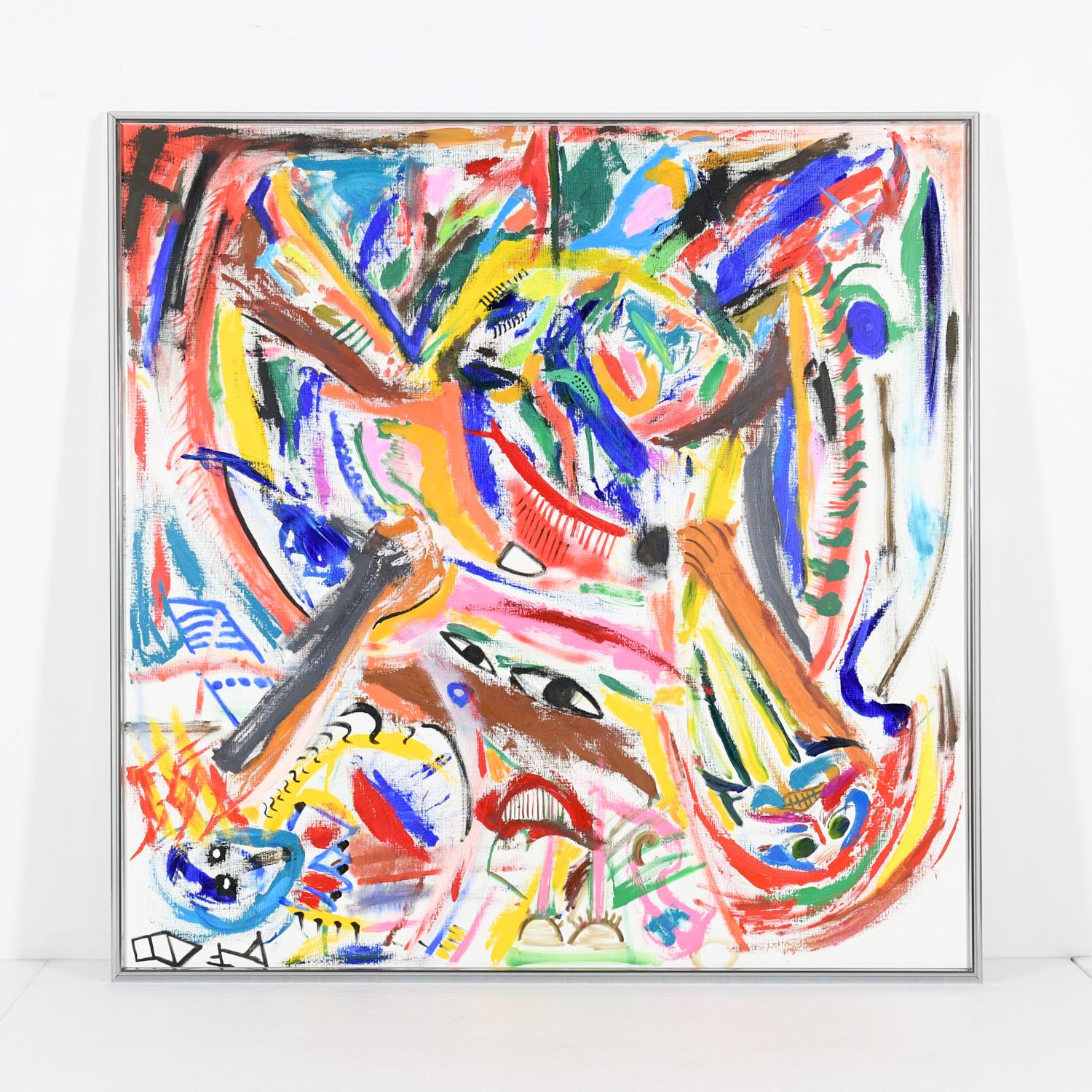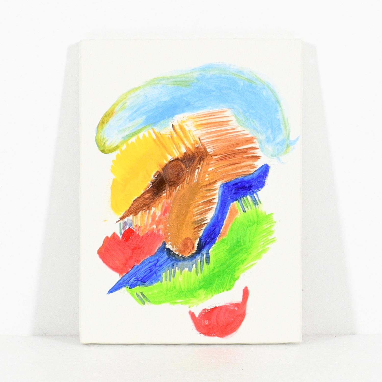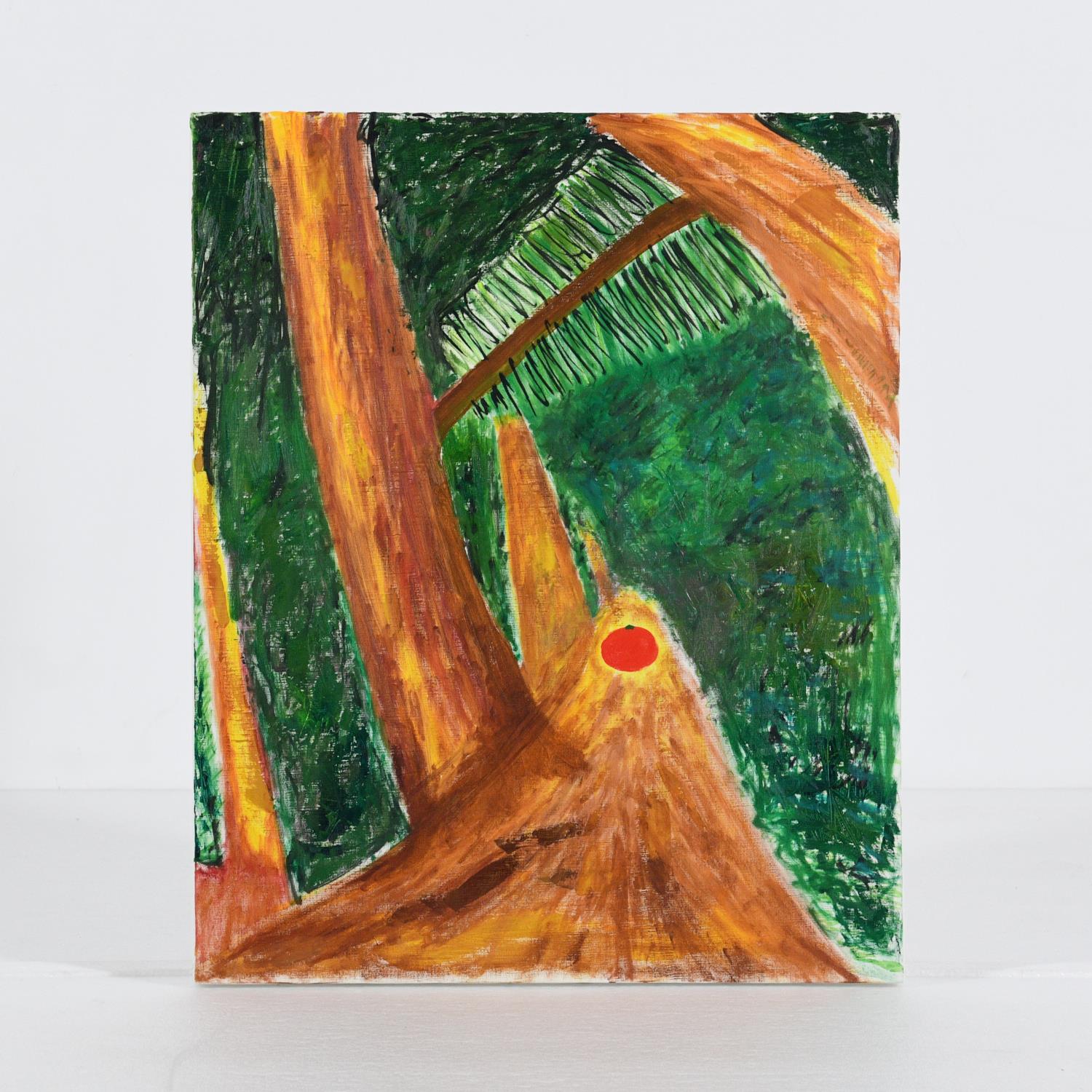 本作は、明確な建築物を描かず、縦方向の反復ライン(緑のストライプ)と、横方向の奔放な筆致(橙のストローク)を組み合わせることで、“塔”そのものよりも、塔を取り巻く混沌・建設のエネルギー・崩壊の兆しを表現している。